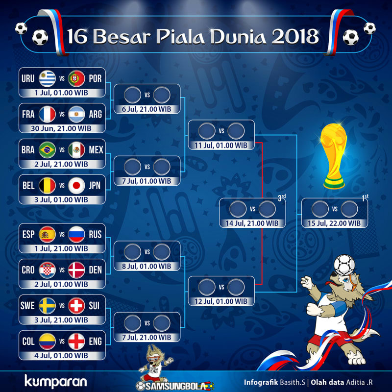 Babak 16 besar ini akan berlangsung selama empat hari dimulai pada Sabtu (30/6/2018) dan akan berakhir pada Selasa (3/7/2018) atau Rabu dini hari WIB.