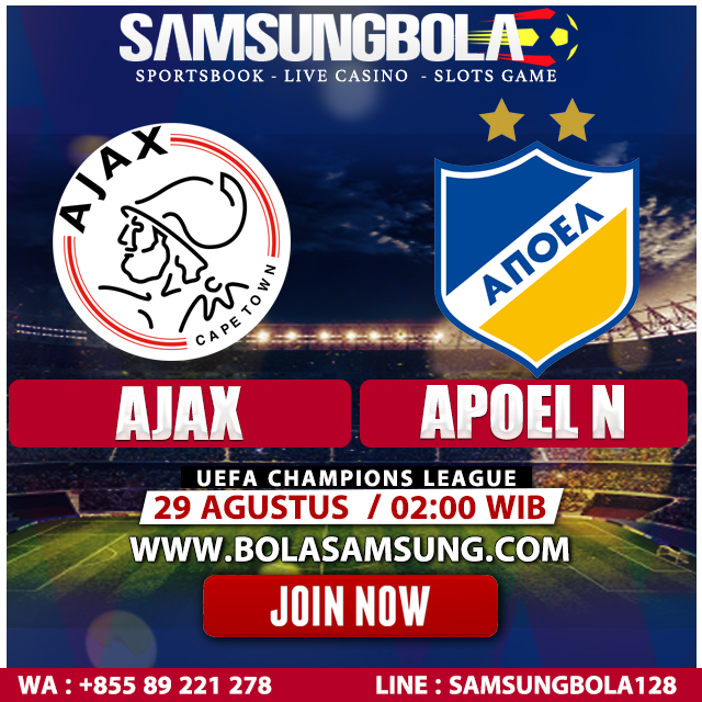 SamsungBola - Prediksi Ajax vs Apoel 29 Agustus 2019 yang akan dilangsungkan di Amsterdam Arena pada hari Kamis 29 Agustus 2019 pada pukul 02:00 Wib. Pada laga pertandingan UEFA Champions League kali ini yang akan mempertemukan kesebelasan Ajax vs Apoel.