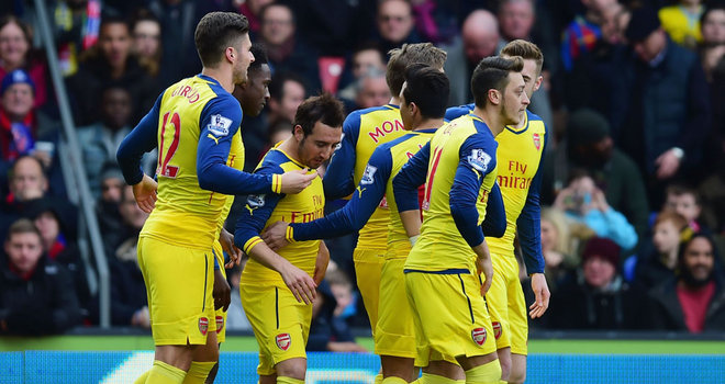 Arsenal meraih kemenangan 2-1 atas Crystal Palace hingga akhir babak pertama pada pertandingan lanjutan Premier League di Stadion Selhurst Park, Sabtu (21/2/2015).